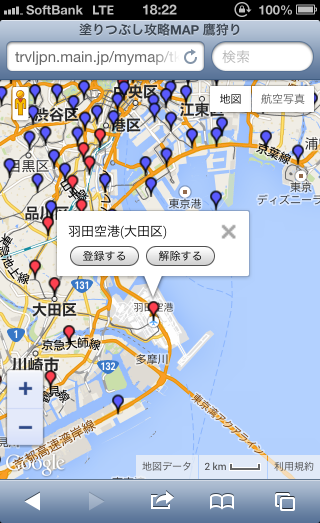 【方法:】1.スマートフォンで塗りつぶしマップにログイン 2.地図で、塗りつぶしたい空のマーカーを選択して情報ウィンドウを表示 3.「登録する」「解除する」を押すと、登録または登録解除ができます 1地点ずつの登録ですが、攻略したその場で塗りつぶししたい時にご利用ください。 |